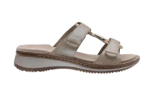 Slipper van Ara in zandkleurig leer op een G wijdte op de leest Hawai. De slipper is met 2 klittenbanden te verstellen. Bij de wreef zit een siersteen. De slipper heeft een ingebouwd voetbed. ||Ara is een Duits merk, die in vele landen zelf produceren. De schoenen zijn vaak zacht en licht van gewicht. Ze maken diverse wijdtes en leesten. De Duitse leest is vaak prima voor de Nederlandse voet. Sommige hebben een uitneembaar voetbed. Ara koopt u online bij Ruttenschoenen.nl