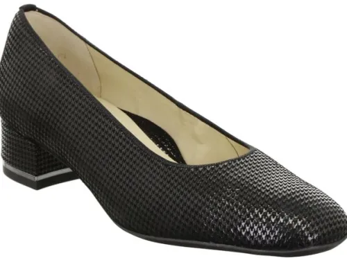 Pump van Ara met elastieken boordband rondom in zwart leer met een printje. De schoen heeft een lage hak ca 30 mm. met een zilver randje bij de hak. Op een brede H wijdte op de leest Graz met highsoft voetbed wat heerlijk zacht loopt. Het voetbed is niet uitneembaar. ||Ara is een Duits merk, die in vele landen zelf produceren. De schoenen zijn vaak zacht en licht van gewicht. Ze maken diverse wijdtes en leesten. De Duitse leest is vaak prima voor de Nederlandse voet. Sommige hebben een uitneembaar voetbed. Ara koopt u online bij ruttenschoenen.nl