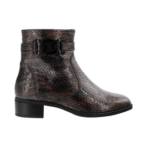 Geklede korte laars van Ara in een slangen print in een bruin combinatie. Gemaakt op een brede H wijdte op de leest Graz met een rits aan de binnenzijde. De laars heeft een klein hakje en een uitneembaar voetbed, waardoor die ook geschikt is voor een eigen steunzool. ||||Ara is een Duits merk, die in vele landen zelf produceren. De schoenen zijn vaak zacht en licht van gewicht. Ze maken diverse wijdtes en leesten. De Duitse leest is vaak prima voor de Nederlandse voet. Sommige hebben een uitneembaar voetbed. Ara koopt u online bij Ruttenschoenen.nl