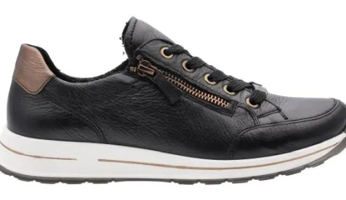 Sneaker van Ara in zwart leer met een stukje cognac. Aan de zijkant zit een rits waardoor die makkelijk is aan en uit te trekken. De zool wikkelt extra makkelijk af en de hak is bijna plat. Gemaakt op een brede H wijdte op de leest Osaka. Het voetbed is uitneembaar, dus de schoen is geschikt voor uw eigen steunzool. ||Ara is een Duits merk, die in vele landen zelf produceren. De schoenen zijn vaak zacht en licht van gewicht. Ze maken diverse wijdtes en leesten. De Duitse leest is vaak prima voor de Nederlandse voet. Sommige hebben een uitneembaar voetbed. Ara koopt u online bij Ruttenschoenen.nl