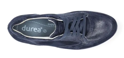 Veterschoen van Durea in donkerblauw kalfssuede in de wijdte K. Deze schoen valt in de groep Citywalker van Durea, waarbij het lopen door de extra hoge teensprong vergemakkelijkt wordt. De schoen heeft een bijna platte hak van 17 mm en rond de enkel zit een polster. De schoen heeft een 2 componenten stijve TPU zool, waardoor zeer geschikt voor hielspoor, peesplaatontsteking en een stijve grote teen. Geschikt voor uw eigen steunzool op een extra brede K plus wijdte, op de leest 288 met een stevig contrefort. Bij de K plus wijdte zit onder het voetbed een extra inlegzool die er ook uit kan en waardoor er nog extra ruimte voor een bredere voet is. ||Durea is een Nederlands fabricaat, met diverse leesten en wijdtematen. Het ontwerp en de afwerking geschiedt in Drunen. De productie vindt in het buitenland plaats, waar Durea eigen fabrieken bezit, onder toezicht van eigen mensen. Iedere schoen ondergaat ca 200 handelingen, Daar Durea alles in eigen beheer heeft kunnen zij hun hoge kwaliteit waarborgen.