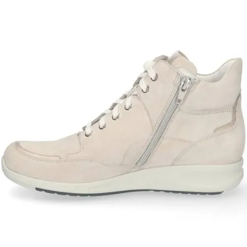 Boot van Durea op de Go leest in bbeige suede met een bijna platte sleehak. Aan de zijkant zit een rits waardoor die makkelijk is aan en uit te trekken. De innovatie van de Go zool zorgt voor een ideaal looppatroon en stimuleert daarmee een natuurlijke houding van het lichaam waarbij het lopen vergemakkelijkt wordt. De boots zijn lichter van gewicht, soepel met dragen en zorgen voor veel demping en stabiliteit. Uitermate geschikt bij een hallux valgus, hallux rigidus, hielspoor, peesplaatontsteking en reuma. Goed te verstellen met een veter, daarbij is de boot gemaakt op een gebroken wijdte dwz dat de boot in de hielpartij smaller is, waardoor die extra goed om de hiel sluit. De zool is van PU en de hak is 1,7 cm hoog. Gemaakt op een extra brede K wijdte op de leest 688. Uiteraard heeft de boot een stevig contrefort en een uitneembaar voetbed. ||Durea is een Nederlands fabricaat, met diverse leesten en wijdtematen. Het ontwerp en de afwerking geschiedt in Drunen. De productie vindt in het buitenland plaats, waar Durea eigen fabrieken bezit, onder toezicht van eigen mensen. Iedere schoen ondergaat ca 200 handelingen, Daar Durea alles in eigen beheer heeft kunnen zij hun hoge kwaliteit waarborgen.