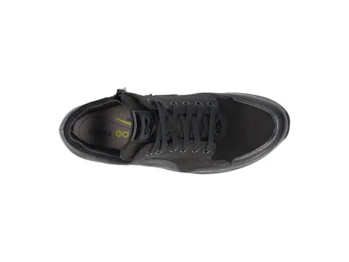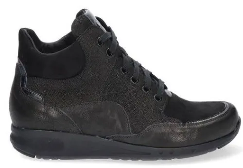 Boot van Durea op de Go zool in zwart leer met nubuck op een bijna platte sleehak. Aan de zijkant zit een rits waardoor die makkelijk is aan en uit te trekken. De innovatie van de Go zool zorgt voor een ideaal looppatroon en stimuleert daarmee een natuurlijke houding van het lichaam waarbij het lopen vergemakkelijkt wordt. De boots zijn lichter van gewicht, soepel met dragen en zorgen voor veel demping en stabiliteit. Uitermate geschikt bij een hallux valgus, hallux rigidus, hielspoor, peesplaatontsteking en reuma. Goed te verstellen met een veter, daarbij is de boot gemaakt op een gebroken wijdte dwz dat de boot in de hielpartij smaller is, waardoor die extra goed om de hiel sluit. De zool is van PU en de hak is 1,7 cm hoog. Gemaakt op een extra brede K wijdte op de leest 688. Uiteraard heeft de boot een stevig contrefort en een uitneembaar voetbed. ||Durea is een Nederlands fabricaat, met diverse leesten en wijdtematen. Het ontwerp en de afwerking geschiedt in Drunen. De productie vindt in het buitenland plaats, waar Durea fabrieken bezit, onder toezicht van eigen mensen. Iedere schoen ondergaat ca 200 handelingen, Daar Durea alles in eigen beheer heeft kunnen zij hun hoge kwaliteit waarborgen. Durea koopt u online bij Ruttenschoenen.nl