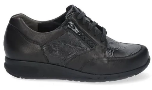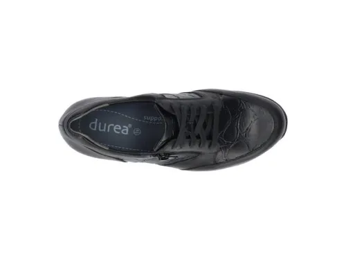 Veterschoen van Durea in zwart leer icm een fantasieprint. Deze schoen wordt gemaakt op een extra brede K plus wijdte. De schoen heeft een doorlopende TPU zool met een bijna platte hak van 17 mm en rond de enkel zit een polster. Aan de zijkant zit een rits waardoor die makkelijker is aan en uit te trekken. Geschikt voor uw eigen steunzool op een extra brede K plus wijdte, op de leest 288 met een stevig contrefort. De plus wil zeggen dat er een extra inlegzool onder de steunzool ligt die eruit gehaald kan worden , waardoor je meer diepte cq wijdte krijgt. De zool is dempend, stabiel en antislip. ||Durea is een Nederlands fabricaat, met diverse leesten en wijdtematen. Het ontwerp en de afwerking geschiedt in Drunen. De productie vindt in het buitenland plaats, waar Durea fabrieken bezit, onder toezicht van eigen mensen. Iedere schoen ondergaat ca 200 handelingen, Daar Durea alles in eigen beheer heeft kunnen zij hun hoge kwaliteit waarborgen. Durea koopt u online en offline bij Ruttenschoenen.nl