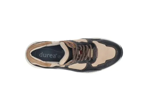 Lichtgewicht sneaker van Durea met een rechte teenligging waardoor er meer ruimte in de breedte voor de tenen is. De schoen is gemaakt van bruin leer met beige suede met een Drymex voering. Daardoor is die lichter van gewicht en luchtiger met dragen. Drymax kan ook goed vocht opnemen. Uitermate geschikt om er een stukje op te wandelen. Gemaakt op een G wijdte op de leest 604. De voetbedden zijn uitneembaar. ||Durea is een Nederlands fabricaat, met diverse leesten en wijdtematen. Het ontwerp en de afwerking geschiedt in Drunen. De productie vindt in het buitenland plaats, waar Durea eigen fabrieken bezit, onder toezicht van eigen mensen. Iedere schoen ondergaat ca 200 handelingen, Daar Durea alles in eigen beheer heeft kunnen zij hun hoge kwaliteit waarborgen.