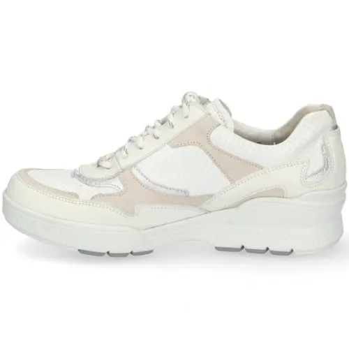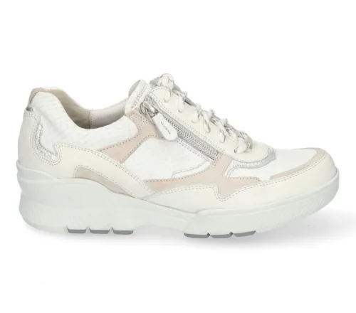 Sneaker van Durea op moderne Go 2.0 zool in wit met beige leer met suede. Kenmerken van de innovatieve Go zool is dat die lichter van gewicht is en zorgt voor een ideaal looppatroon welke de natuurlijke houding van het lichaam stimuleert. Aan de zijkant zit een rits zodat als de veter eenmaal is ingesteld de schoen makkelijk aan en uit te trekken is. Tevens zorgt de zool voor veel demping. Gemaakt op een brede H wijdte op de leest 685. De hak is 1,7 cm hoog. De schoen heeft een uitneembaar voetbed en is geschikt voor uw eigen steunzool. ||Durea is een Nederlands fabricaat, met diverse leesten en wijdtematen. Het ontwerp en de afwerking geschiedt in Drunen. De productie vindt in het buitenland plaats, waar Durea eigen fabrieken bezit, onder toezicht van eigen mensen. Iedere schoen ondergaat ca 200 handelingen, Daar Durea alles in eigen beheer heeft kunnen zij hun hoge kwaliteit waarborgen. Durea koopt u off en online bij Ruttenschoenen.nl