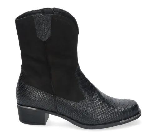 Westernlaars van Durea in zwart leer met een print in combinatie met nubuck met een rits aan de binnenzijde. Gemaakt op een brede H wijdte op de leest 995 met de TPU zool Veerle. Bij de hak en de voorzijde een zilverkleurige bit. Dit laarsje heeft een hakhoogte van 33 mm en is geschikt voor uw eigen steunzool. Uiteraard heeft de laars een stevig contrefort. ||Durea is een Nederlands fabricaat, met diverse leesten en wijdtematen. Het ontwerp en de afwerking geschiedt in Drunen. De productie vindt in het buitenland plaats, waar Durea fabrieken bezit, onder toezicht van eigen mensen. Iedere schoen ondergaat ca 200 handelingen, Daar Durea alles in eigen beheer heeft kunnen zij hun hoge kwaliteit waarborgen.