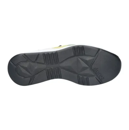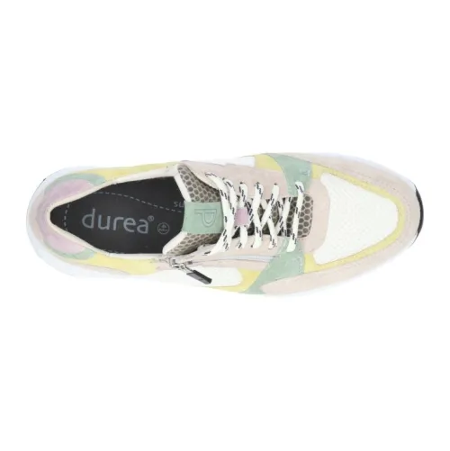 Lichtgewicht sneaker van Durea met een rechte teenligging waardoor er meer ruimte in de breedte voor de tenen is. De schoen is gemaakt van beige met geel en groen suede en leer met een Drymex voering. Daardoor is die lichter van gewicht en luchtiger met dragen. Drymax kan ook goed vocht opnemen. Uitermate geschikt om er een stukje op te wandelen. Geschikt voor iets bredere voet op de H wijdte op de leest 605. De voetbedden zijn uitneembaar. ||Durea is een Nederlands fabricaat, met diverse leesten en wijdtematen. Het ontwerp en de afwerking geschiedt in Drunen. De productie vindt in het buitenland plaats, waar Durea fabrieken bezit, onder toezicht van eigen mensen. Iedere schoen ondergaat ca 200 handelingen, Daar Durea alles in eigen beheer heeft kunnen zij hun hoge kwaliteit waarborgen. Durea koopt u online en offline bij Ruttenschoenen.nl