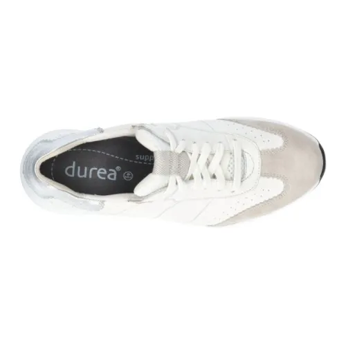 Lichtgewicht sneaker van Durea met een rechte teenligging waardoor er meer ruimte in de breedte voor de tenen is. De schoen is gemaakt van wit leer met beige suede met een Drymex voering. Daardoor is die lichter van gewicht en luchtiger met dragen. Drymax kan ook goed vocht opnemen. Uitermate geschikt om er een stukje op te wandelen. Gemaakt op een H wijdte op de leest 605. De voetbedden zijn uitneembaar. ||Durea is een Nederlands fabricaat, met diverse leesten en wijdtematen. Het ontwerp en de afwerking geschiedt in Drunen. De productie vindt in het buitenland plaats, waar Durea fabrieken bezit, onder toezicht van eigen mensen. Iedere schoen ondergaat ca 200 handelingen, Daar Durea alles in eigen beheer heeft kunnen zij hun hoge kwaliteit waarborgen. Durea koopt u online en offline bij Ruttenschoenen.nl