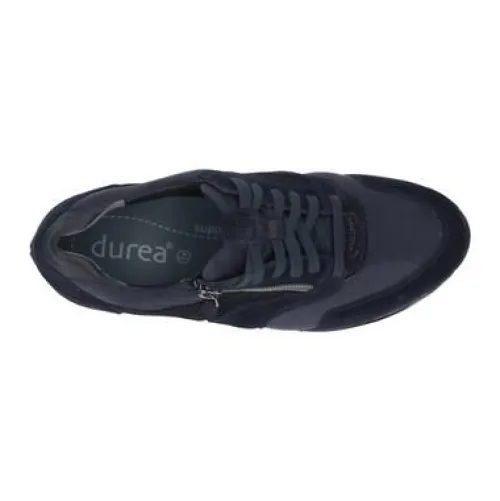 Sneaker van Durea in een blauw leer met suede met stretchmateriaal bij de bal van de voet. Door het stretch materiaal is die fijn voor de gevoelige voet. Gemaakt op een extra brede K wijdte op de leest 688. Aan de zijkant zit een rits waardoor die makkelijk is aan en uit te trekken. Geschikt voor brede voeten met een uitneembaar voetbed waarvoor u uw eigen steunzool kunt vervangen. De schoen is stabiel en slijtvast en biedt veel demping bij de voorvoet. De schoen is gemaakt op een gebroken wijdte dwz dat de schoen in de hielpartij smaller is, waardoor die extra goed om de hiel sluit. De zool is van Eva gemaakt en de hak is 1,7 cm hoog. De zool heeft een extra afwikkeling. ||Durea is een Nederlands fabricaat, met diverse leesten en wijdtematen. Het ontwerp en de afwerking geschiedt in Drunen. De productie vindt in het buitenland plaats, waar Durea eigen fabrieken bezit, onder toezicht van eigen mensen. Iedere schoen ondergaat ca 200 handelingen, Daar Durea alles in eigen beheer heeft kunnen zij hun hoge kwaliteit waarborgen. Durea koopt u offline en online bij Ruttenschoenen.nl