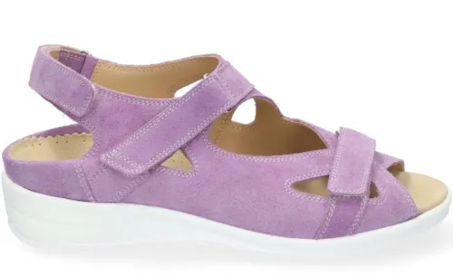 Sandaal van Durea met 2 klittenbanden over de voet en een klittenband aan de achterzijde. Gemaakt in lila suede.Door de nieuwe licht gekleurde zool wordt de sandaal moderner. De leest en hakhoogte is identiek aan de bekende sandaal. Geschikt voor uw eigen steunzool op een extra brede K wijdte, op de leest 219 met een lage hak van 2 cm. De sleehak is 2 cm en de stabiele flexibele antislip zool is gemaakt van Pu met demping. ||Durea is een Nederlands fabricaat, met diverse leesten en wijdtematen. Het ontwerp en de afwerking geschiedt in Drunen. De productie vindt in het buitenland plaats, waar Durea eigen fabrieken bezit, onder toezicht van eigen mensen. Iedere schoen ondergaat ca 200 handelingen, Daar Durea alles in eigen beheer heeft kunnen zij hun hoge kwaliteit waarborgen.