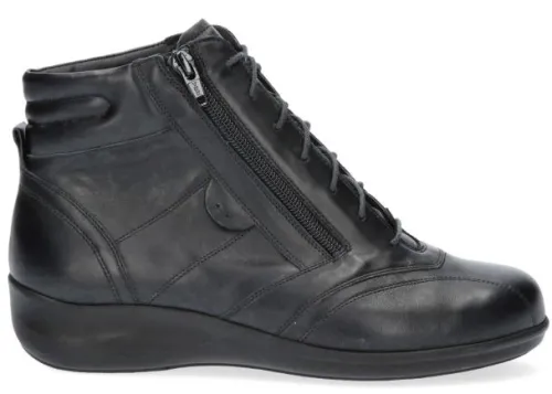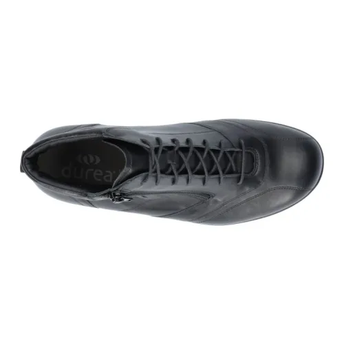 Boot van Durea in zwart leer met met een gepolsterde rand bij de enkel. De boot heeft een rits aan de buitenzijde, waardoor die eenmaal met de veter gesteld, makkelijk uit en aan te trekken is. Deze boot heeft een bijna platte hak en is geschikt voor uw eigen steunzool. Op een super brede K plus wijdte, op de leest 248 met extra ruimte bij de tenen. Uiteraard heeft de boot een stevig contrefort. ||Durea is een Nederlands fabricaat, met diverse leesten en wijdtematen. Het ontwerp en de afwerking geschiedt in Drunen. De productie vindt in het buitenland plaats, waar Durea fabrieken bezit, onder toezicht van eigen mensen. Iedere schoen ondergaat ca 200 handelingen, Daar Durea alles in eigen beheer heeft kunnen zij hun hoge kwaliteit waarborgen.