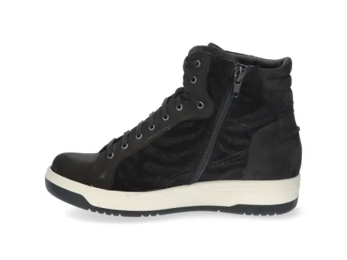 Boot van Durea op een extra brede Kplus wijdte in zwart nubuck met suede in combinatie met een print. Gemaakt op de leest 288 waarbij extra ruimte is gemaakt voor een knok (hallux valgus) met de zool Tennis. Deze zool is stabiel, dempend en antislip en heeft een neutrale afwikkeling. Aan de binnenzijde zit een rits waardoor die makkelijk is aan en uit te trekken. De voetbedden zijn uitneembaar. ||Durea is een Nederlands fabricaat, met diverse leesten en wijdtematen. Het ontwerp en de afwerking geschiedt in Drunen. De productie vindt in het buitenland plaats, waar Durea eigen fabrieken bezit, onder toezicht van eigen mensen. Iedere schoen ondergaat ca 200 handelingen, Daar Durea alles in eigen beheer heeft kunnen zij hun hoge kwaliteit waarborgen.