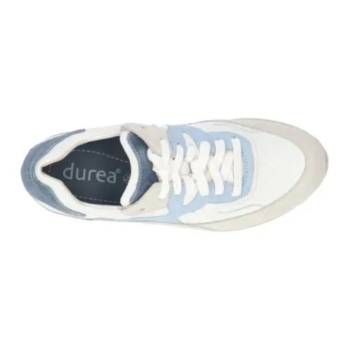 Durea sneaker in off white suede met blauwe inzet in een brede K wijdte leest 688. De schoen is stabiel en slijtvast en biedt veel demping bij de voorvoet. Aan de zijkant zit een rits en is daarbij ook te verstellen met een veter. De schoen is gemaakt op een gebroken wijdte dwz dat de schoen in de hielpartij smaller is, waardoor die extra goed om de hiel sluit. De zool is van pu met tpu en de hak is 1,7 cm hoog. Het uitneembare voetbed maakt dat die geschikt is voor uw eigen steunzool. ||Durea is een Nederlands fabricaat, met diverse leesten en wijdtematen. Het ontwerp en de afwerking geschiedt in Drunen. De productie vindt in het buitenland plaats, waar Durea eigen fabrieken bezit, onder toezicht van eigen mensen. Iedere schoen ondergaat ca 200 handelingen, Daar Durea alles in eigen beheer heeft kunnen zij hun hoge kwaliteit waarborgen.