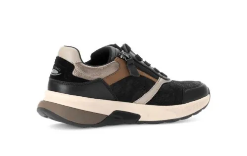 Sneaker van Gabor in zwart leer gecombineerd met beige tinten op een wijdte G op een Rolling soft onderwerk met een dikkere zool. Deze leest heeft een speciale zool waarbij het lopen vergemakkelijkt wordt. De sneaker heeft 2 ritsen, waardoor die makkelijk is aan en uit te tekken. Het voetbed is uitneembaar, dus geschikt voor uw eigen steunzool. De sneaker heeft een hakhoogte van ca 20 mm. ||Gabor is een Duits fabricaat, met diverse leesten en wijdtematen. Ze staan bekend om hun goede leesten en zachte leersoorten. Modisch comfortabel tegen betaalbare prijzen. Sommige hebben een uitneembaar voetbed. Gabor koop je online bij Ruttenschoenen.