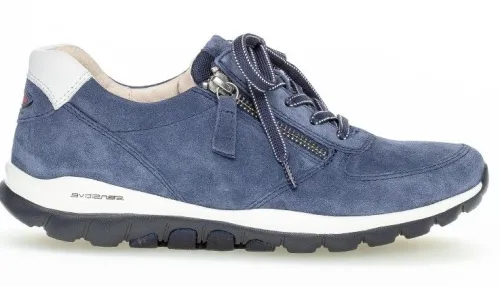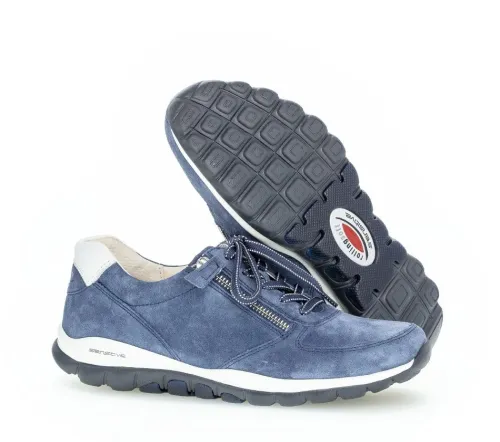 Sneaker van Gabor in jeans suede met witte details op een wijdte G op de leest GFP met een Rolling soft onderwerk. Deze leest heeft een speciale zool waarbij het lopen vergemakkelijkt wordt. Aan de 2 zijden zit een rits, waardoor die makkelijk is aan en uit te tekken. Het voetbed is uitneembaar, dus geschikt voor uw eigen steunzool. De sneaker heeft een hakhoogte van 20 mm. ||Gabor is een Duits fabricaat, met diverse leesten en wijdtematen. Ze staan bekend om hun goede leesten en zachte leersoorten. Modisch comfortabel tegen betaalbare prijzen. Sommige hebben een uitneembaar voetbed. Gabor koop je online bij Ruttenschoenen.