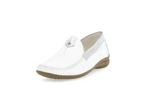 Bekende mocassin van Gabor weer helemaal terug van weggeweest. In wit met zilver leer op een wijdte G. Aan de zijkanten zit elastiek waardoor die beter aansluit. Door de eigenschappen van een mocassin maakwijze is de schoen licht van gewicht en soepel met dragen. Wel moet je ze goed inspuiten want door de stiknaden zijn ze gevoeliger voor vocht. Deze schoen is niet geschikt voor uw eigen steunzool. ||Gabor is een Duits fabricaat, met diverse leesten en wijdtematen. Ze staan bekend om hun goede leesten en zachte leersoorten. Modisch comfortabel tegen betaalbare prijzen. Sommige hebben een uitneembaar voetbed. Gabor koop je online bij Ruttenschoenen.nl
