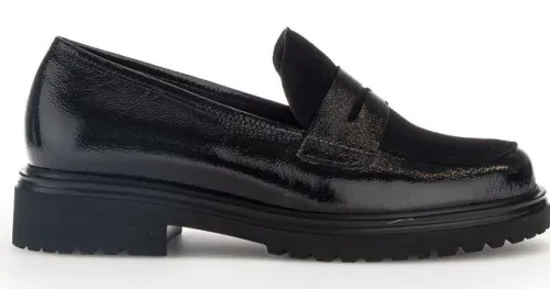 Sportieve instapper van Gabor in zwart lak met een suede spiegel op een wijdte H op de leest Davos. Over de wreef zit een sierband en de schoen heeft een lage brede hak. De voetbedden zijn uitneembaar. ||Gabor is een Duits fabricaat, met diverse leesten en wijdtematen. Ze staan bekend om hun goede leesten en zachte leersoorten. Modisch comfortabel tegen betaalbare prijzen. Sommige hebben een uitneembaar voetbed. Gabor koop je online bij Ruttenschoenen.nl