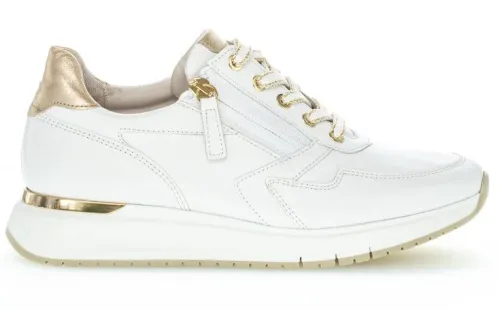 Sneaker van Gabor in wit leer met goud accenten op een brede H wijdte op de leest Davos. De sneaker heeft een wat dikkere zool. Aan de zijkant zit een rits waardoor die makkelijk is aan en uit te trekken. De hak is bijna plat en het voetbed is uitneembaar. ||Gabor is een Duits fabricaat, met diverse leesten en wijdtematen. Ze staan bekend om hun goede leesten en zachte leersoorten. Modisch comfortabel tegen betaalbare prijzen. Sommige hebben een uitneembaar voetbed.