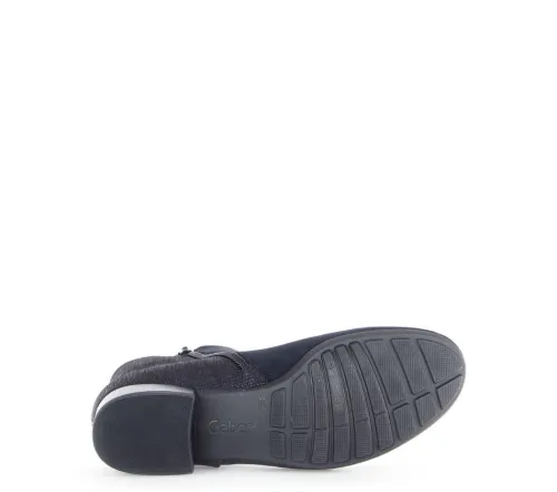 Korte laars van Gabor in blauw suede met aan de achterzijde een fijne print op de wijdte H op de leest Pisa. Aan de binnenzijde zit een rits waardoor die makkelijk is aan en uit te trekken. Aan de buitenzijde zit een siergesp. De laars heeft een lage hak en een uitneembaar voetbed. ||Gabor is een Duits fabricaat, met diverse leesten en wijdtematen. Ze staan bekend om hun goede leesten en zachte leersoorten. Modisch comfortabel tegen betaalbare prijzen. Sommige hebben een uitneembaar voetbed.