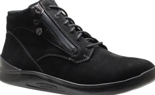 Boot van Ganter met een rechte teenligging en veel ruimte voor de tenen in de breedte. Gemaakt op een brede H wijdte op de leest Helen in zwart nubuck met een rits aan de zijkant. Het voorblad is glad en ook heel fijn voor gevoelige voeten. De zool heeft een afrolsysteem waardoor het lopen vergemakkelijkt wordt. De voetbedden zijn uitneembaar. ||Ganter is een Duits fabrikaat dat pasvorm en milieu hoog in het vaandel heeft. Zij maken gespecialiseerde leesten en oplossingen voor probleemvoeten.