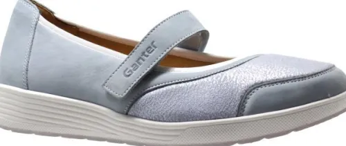Bandschoen van Ganter met een klittenband te verstellen in licht blauw. Gemaakt op een extra brede K wijdte op de leest Klara met stretchstof over de bal van de voet. Deze is geschikt voor een gevoelige voet en heeft een uitneembaar voetbed. ||Ganter is een Duits fabricaat, met diverse leesten en wijdtematen. Zij hebben pasvorm, natuur en milieu hoog in het vaandel. Ze maken tijdloze schoenen en gebruiken daarbij materialen die zo min mogelijk het milieu belasten. Zoals plantaardig gelooid leer, kurken voetbedden tot aan papier uit duurzame bosbouw. Ganter koopt u online bij ruttenschoenen.nl
