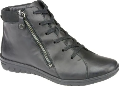 Boot van Hartjes in zwart leer met een rits aan de buitenzijde, waardoor als de veter is gesteld, de boot makkelijk aan en uit te trekken is. Gemaakt op een G½ wijdte, dus voor veel voeten geschikt. De boot is zeer licht en soepel met dragen en geschikt voor uw eigen steunzool. Heeft een platte hak van ca 15 mm en is vervaardigd uit zacht plantaardig gelooid leer. Kenmerkend is het lichte gewicht en het zachte gevoel met lopen. ||Hartjes is een Oostenrijks merk wat al sinds 1953 comfortabel schoeisel produceert, met de hoogste kwaliteit en een rijke traditie van Oostenrijks schoenmakershandwerk. Het is een echt groen merk en produceren uitsluitend milieu vriendelijk in het hart van europa, met goede vakmensen, die onder goede omstandigheden werken. Innovatief , zoals het geïntegreerde , uitneembare lichtgewicht kurkvoetbed, natuurlijke voeringmaterialen als lamvel en walkloden (100% zuiver scheerwol), de plantaardig gelooide leersoorten. Hartjes verwerkt alleen hoogwaardige leersoorten. Ze beschermen de voet door haar robuustheid, de binnenzijde voelt zijdezacht aan en door haar natuurlijke, nerfstructuur maakt het iedere schoen uniek.