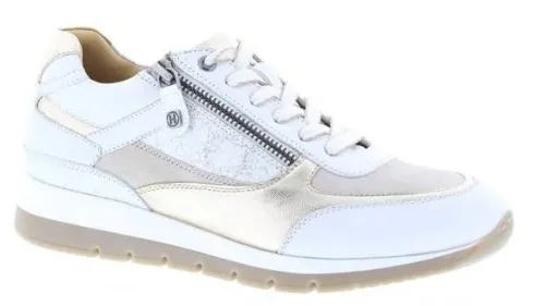 Sneaker van Helioform met een rits aan de zijkant in wit leer met licht beige, goud metallic en een print. De zool is in dezelfde combinatie gemaakt. Gemaakt op een brede H wijdte op de leest 293. Rond de enkel is de schoen gepolsterd. De schoen heeft een stevige zool. De voetbedden zijn uitneembaar en ze zijn dus geschikt voor uw eigen steunzool. ||Helioform is een Nederlands fabrikaat in een populaire prijsklasse, de schoenen worden in Nederland ontworpen en tegenwoordig onder streng toezicht voor goede arbeidsomstandigheden in India gemaakt. Ze maken verschillende wijdtematen en meestal zijn ze geschikt voor eigen steunzool. Helioform koopt u online bij Ruttenschoenen.nl