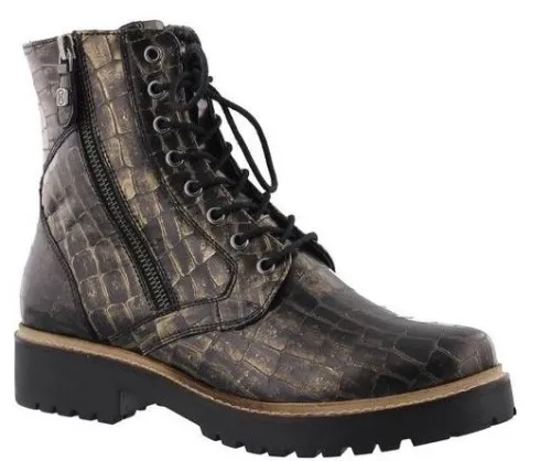 Sportieve Bikerboot van Helioform met 2 ritsen in grijs met brons gevlamd leer met een croco print. Door de ritsen zijn ze extra makkelijk uit en aan te trekken. Gemaakt op een brede H wijdte op de leest 689 met een bijna platte hak. De voetbedden zijn uitneembaar en ze zijn dus geschikt voor eigen steunzool. ||Helioform is een Nederlands fabrikaat in een populaire prijsklasse, de schoenen worden in Nederland ontworpen en tegenwoordig onder streng toezicht voor goede arbeidsomstandigheden in India gemaakt. Ze maken verschillende wijdtematen en meestal zijn ze geschikt voor eigen steunzool.