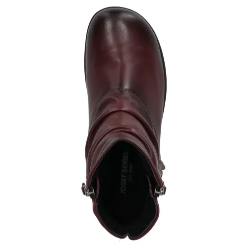 Korte laars van Josef Seibel in bordeaux rood leer. De laars heeft aan beide zijden een rits waardoor die makkelijk is aan en uit te trekken. Bij de wreef is de laars geplooid. De voetbedden zijn uitneembaar. ||Josef Seibel maakt schoenen sinds 1886. Het is een familiebedrijf en de fabriek staat in het Duitse Hauenstein. Ze maken leren schoenen met een goede pasvorm en een prima prijs/kwaliteit verhouding. Vaak zijn de voetbedden uitneembaar.
