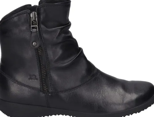 Korte laars van Josef Seibel in zwart leer. De laars heeft aan beide zijden een rits waardoor die makkelijk is aan en uit te trekken. Bij de wreef is de laars geplooid. De voetbedden zijn uitneembaar. ||Josef Seibel maakt schoenen sinds 1886. Het is een familiebedrijf en de fabriek staat in het Duitse Hauenstein. Ze maken leren schoenen met een goede pasvorm en een prima prijs/kwaliteit verhouding. Vaak zijn de voetbedden uitneembaar.