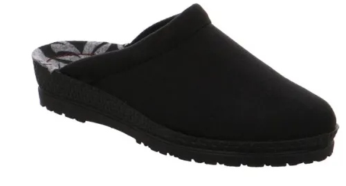 Dames pantoffelslipper van Rohde in zwart velours met voetbed. Aan de bovenkant is die gepolsterd en verder geheel glad. De slipper heeft aan de binnenzijde op de zool een aparte tekening. De hak is bijna plat ||Rohde is een Duitse firma, het schoeisel wordt hoofdzakelijk in de aziatische landen gefabriceerd.