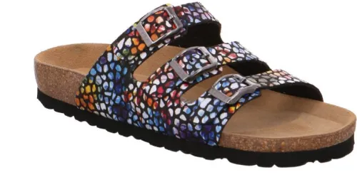 Slipper van Rohde met 3 gespen te verstellen in blauw met rood en wit gecombineerd. Op een G wijdte met een zacht kurken voetbed. Het zijn comfortabele slippers. De hak is ca 20 mm hoog en de voetbedden zijn niet uitneembaar. ||Rohde is van Duitse oorsprong en inmiddels in Italiaanse handen, die het merk een nieuw elan heeft gegeven. Het meeste wordt in Europa gefabriceerd.