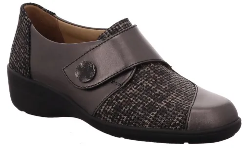 Klittenband schoen van Solidus, verstelbaar met klittenband in grijs leer met een breilook print. De schoen heeft een lage hak van ca 25 mm. Geschikt voor uw eigen steunzool op een smalle F wijdte, op de leest Hedda. Deze leest is met name geschikt voor een magere knokige voet. ||Solidus is een Duits fabricaat, met diverse leesten en wijdtematen, van smal tot super breed. Ze gebruiken zachte leersoorten, waardoor ze vaak zeer comfortabel en geschikt voor gevoelige voeten zijn. Vor de zeer gevoelige en of diabete voet, maken ze ook nog een speciale collectie “Solicare” Veel leesten en artikelen komen vaak weer terug, veelal in een andere uitvoering. Solidus koop je offline en online bij Ruttenschoenen.nl