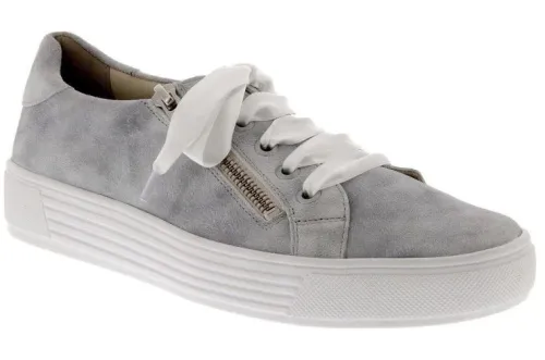 Sneaker van Solidus met lintveter en rits in licht grijs suede. Gemaakt op een extra smalle F wijdte op de leest Hazel met een lage sleehak van ca 20 mm hoog. De voetbedden zijn uitneembaar en ze zijn dus geschikt voor uw eigen steunzool. ||Solidus is een Duits fabricaat, met diverse leesten en wijdtematen, van smal tot super breed. Ze gebruiken zachte leersoorten, waardoor ze vaak zeer comfortabel en geschikt voor gevoelige voeten zijn. Voor de zeer gevoelige en of diabete voet, maken ze ook nog een speciale collectie “Solicare” Veel leesten en artikelen komen vaak weer terug, veelal in een andere uitvoering. Solidus koopt u off en online bij Ruttenschoenen.nl
