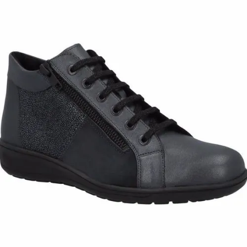 Boot van Solidus verstelbaar met een veter in grijs metalic leer met nubuck en een fijne print. Op een lage hak van ca 25 mm. Geschikt voor uw eigen steunzool op een brede H wijdte, op de leest Heaven. De voetbedden zijn uitneembaar. ||Solidus is een Duits fabricaat, met diverse leesten en wijdtematen, van smal tot super breed. Ze gebruiken zachte leersoorten, waardoor ze vaak zeer comfortabel en geschikt voor gevoelige voeten zijn. Voor de zeer gevoelige en/ of diabete voet, maken ze ook nog een speciale collectie “Solicare” Veel leesten en artikelen komen vaak weer terug, veelal in een andere uitvoering. Solidus koopt u off en online bij Ruttenschoenen.nl