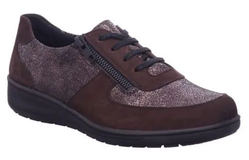 Sneaker van Solidus in bruin nubuck icm een fantasieprint op een extra brede K wijdte op de leest Kate. Aan de zijkant zit een rits, waardoor die makkelijk is aan en uit te trekken. De voetbedden zijn uitneembaar. ||Solidus is een Duits fabricaat, met diverse leesten en wijdtematen, tot super breed. Ze gebruiken zachte leersoorten, waardoor ze vaak zeer comfortabel en geschikt voor gevoelige voeten zijn. De schoenen zijn ook vaak lichter van gewicht. Veel leesten en artikelen komen vaak weer terug, veelal in een andere uitvoering.