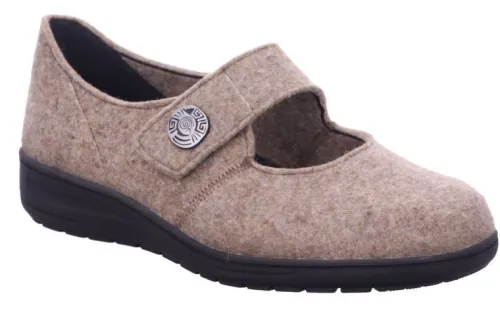 Pantoffel van Solidus in beige vilt verstelbaar met een klittenband. Vilt dat bestaat uit 80% wol versterkt met 20% Polyamide. Gemaakt op een extra brede K wijdte op de leest Kate. De voetbedden zijn uitneembaar en daardoor is de pantoffel geschikt voor uw eigen steunzool. ||Solidus is een Duits fabricaat, met diverse leesten en wijdtematen, van smal tot super breed. Ze gebruiken zachte leersoorten, waardoor ze vaak zeer comfortabel en geschikt voor gevoelige voeten zijn. Voor de zeer gevoelige en of diabete voet, maken ze ook nog een speciale collectie “Solicare” Veel leesten en artikelen komen vaak weer terug, veelal in een andere uitvoering. Solidus koop je off en online bij Ruttenschoenen.nl