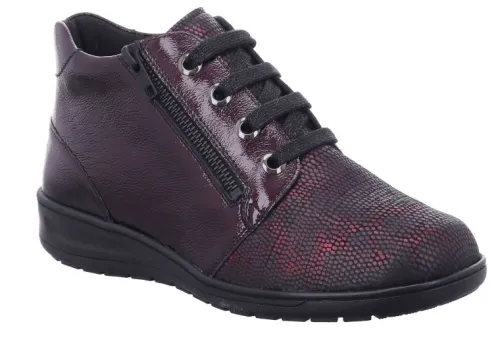 Boot van Solidus verstelbaar met een veter in bordeau leer met nubuck en een stretch croco print. Op een lage hak van ca 25 mm. Geschikt voor uw eigen steunzool op een extra brede K wijdte, op de leest Kate. Deze boot is met name geschikt voor een brede gevoelige voet. ||Solidus is een Duits fabricaat, met diverse leesten en wijdtematen, van smal tot super breed. Ze gebruiken zachte leersoorten, waardoor ze vaak zeer comfortabel en geschikt voor gevoelige voeten zijn. Vor de zeer gevoelige en of diabete voet, maken ze ook nog een speciale collectie “Solicare” Veel leesten en artikelen komen vaak weer terug, veelal in een andere uitvoering. Solidus koopt u off en online bij Ruttenschoenen.nl