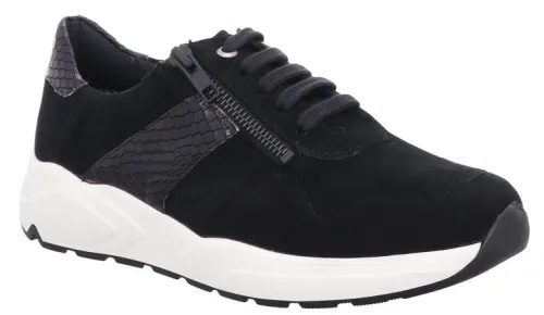 Sneaker van Solidus met veter te verstellen in zwart suede in combinatie met een crocoprint aan de zijkant en bij de hiel. Aan de zijkant zit een rits waardoor als de veter eenmaal gesteld is de schoen makkelijk aan en uit te trekken is. De nieuwe “chunky”zool maakt het een sneaker helemaal van deze tijd. Gemaakt op een extra brede K wijdte op de leest Kea met een lage sleehak van ca 20 mm hoog. De voetbedden zijn uitneembaar en de schoen is dus geschikt voor uw eigen steunzool. ||Solidus is een Duits fabricaat, met diverse leesten en wijdtematen, van smal tot super breed. Ze gebruiken zachte leersoorten, waardoor ze vaak zeer comfortabel en geschikt voor gevoelige voeten zijn. Voor de zeer gevoelige en of diabete voet, maken ze ook nog een speciale collectie “Solicare” Veel leesten en artikelen komen vaak weer terug, veelal in een andere uitvoering. Solidus koopt u online bij Ruttenschoenen.nl