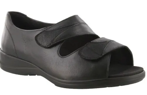 Sandaal van Solidus met een dichte hiel en 2 klittenbanden over de wreef. Uitgevoerd in zwart leer in combinatie met een fijne print op de banden. Gemaakt op een brede K wijdte op de leest Lia met een bijna platte hak van ca 25 mm hoog. De voetbedden zijn uitneembaar en ze zijn dus geschikt voor uw eigen steunzool. ||Solidus is een Duits fabricaat, met diverse leesten en wijdtematen, van smal tot super breed. Ze gebruiken zachte leersoorten, waardoor ze vaak zeer comfortabel en geschikt voor gevoelige voeten zijn. Voor de zeer gevoelige en of diabete voet, maken ze ook nog een speciale collectie “Solicare” Veel leesten en artikelen komen vaak weer terug, veelal in een andere uitvoering. Solidus koopt u online bij Ruttenschoenen.nl
