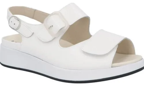 Een sandaal van solidus in het wit lakleer met 2 klittenbanden op de voet en een drukker bij de hiel, daardoor is deze goed te verstellen. Gemaakt op de extra brede K wijdte op de leest kami. Het voetbed is uitneembaar en dus geschikt voor uw eigen podologische zolen. De dikke witte zool heeft een moderne uitstraling en een goede stabiele afwikkeling.
