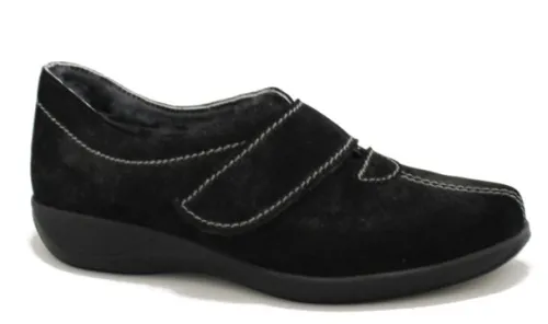 Dichte damespantoffels van Stuppy in zwart velours, gevoerd met lamsvacht. Heerlijk warm voor mensen met koude voeten. De pantoffel heeft een uitneembaar voetbed en is dus geschikt voor uw eigen steunzool. De pantoffel is te verstellen met een klittenband, waardoor veel mogelijkheid tot passen. De hak is bijna plat ca 20 mm. ||Stuppy is een specialistisch klein fabricaat ontstaan in de 50er jaren, wat u niet overal zal tegenkomen. Ze maken o.a hoogwaardige pantoffels waar de voetbedden uitkunnen. Het is een echt comfort merk.