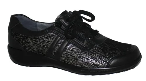 Sneaker met veter te verstellen van Stuppy in zwart leer in combinatie met een fantasieprint waarin stretch verwerkt is. Aan de zijkant zitten 2 ritsen, waardoor als de veter eenmaal is goed ingesteld de schoen makkelijk is aan en uit te trekken. Zeer geschikt voor brede voeten die gevoelig zijn. Gemaakt op een H wijdte. Het voetbed is uitneembaar en de schoen is dus geschikt voor uw eigen steunzool. De hak is bijna plat ca 20 mm. ||Stuppy is een specialistisch klein fabricaat ontstaan in de 50er jaren, wat u niet overal zal tegenkomen. Ze maken o.a hoogwaardige pantoffels waar de voetbedden uitkunnen. Maar ook comfortabele dames en heren schoenen met uitneembare voetbedden. Er worden veeal stretch materialen gebruikt. Het is een echt comfort merk. Stuppy koopt u online bij Ruttenschoenen.nl