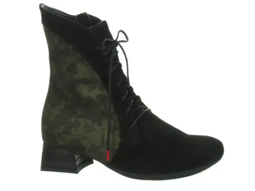 Boot van Think met een aparte blokhak van ca 3 cm in zwart suede met aan de achterzijde een groene fantasie print. De boot is halfhoog op de leest Delizia. Aan de binnenzijde zit een rits waardoor die makkelijk is aan en uit te trekken. De voetbedden zijn uitneembaar. ||Think komt uit Oostenrijk en staat bekend om hun aparte modellen en uitvoeringen met daarbij hoogwaardige leersoorten. Meestal zijn de voetbedden uitneembaar.