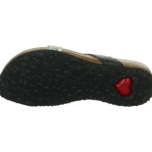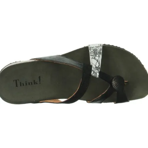 Teenslipper van Think met een bijna platte hak in zwart met wit en grijs leer. De slipper is met leer gevoerd en gemaakt op de leest Julia. Het kurken ingebouwde voetbed ondersteunt de voet goed. ||Think is een merk wat uit Oostenrijk komt en bekend staat om hun eigenzinnige collectie vervaardigd uit mooie en aparte materialen. De meeste voetbedden zijn uitneembaar. Het leer wordt plantaardig gelooid. Think maakt geen wijdte maten, maar de schoenen worden vaak op een bredere leest gemaakt. Think koopt u online bij Ruttenschoenen.nl
