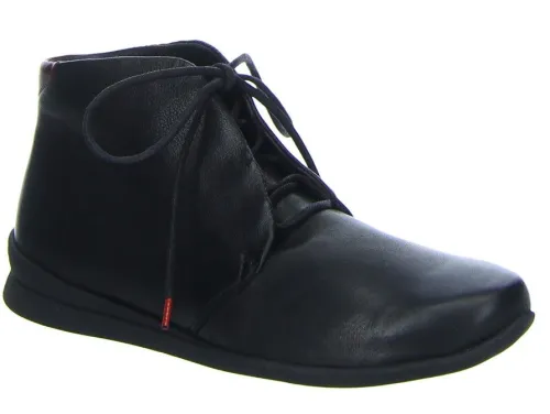 Boot van Think met een soepele zool in zwart leer op de leest Spuat. De boot heeft een zgn verborgen veter. Het voorblad van de boot is glad zonder naden en gemaakt van zacht en soepel leer. De voetbedden zijn uitneembaar. ||Think komt uit Oostenrijk en staat bekend om hun aparte modellen en uitvoeringen met daarbij hoogwaardige leersoorten. Meestal zijn de voetbedden uitneembaar.