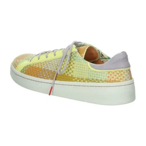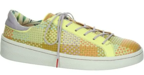 Sneaker van Think in een gele combinatie zacht leer met een vlechtwerk print, wat de sneaker net wat extra’s geeft. De sneaker heeft een lange vetersluiting, waardoor die aan veel voeten past. De schoen heeft een stevig contrefort en is gemaakt op de leest Kumi. De zool is stabiel en de hak is bijna plat. De voetbedden zijn uitneembaar waardoor de schoen geschikt is voor een eigen steunzool. ||Think is een merk wat uit Oostenrijk komt en bekend staat om hun eigenzinnige collectie vervaardigd uit mooie en aparte materialen. De meeste voetbedden zijn uitneembaar. Het leer wordt plantaardig gelooid. Think maakt geen wijdte maten, maar de schoenen worden vaak op een bredere leest gemaakt.