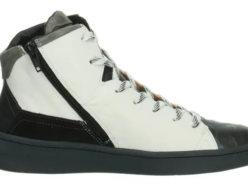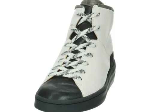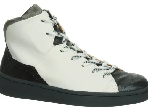 Boot van Think in wit met zwart leer met bij de enkels een zachte polstering. De rits aan de binnenzijde maakt dat die makkelijk is aan en uit te trekken. De boot heeft een bijna platte hak en een lichte profielzool. Gemaakt op de leest Kumi. Think maakt niet echt wijdtematen, maar is vaak geschikt voor een vollere voet. De voetbedden zijn uitneembaar, dus geschikt voor eigen steunzool. ||Think is een merk uit Oostenrijk en kenmerkt zich door aparte ontwerpen, met een prima pasvorm, gemaakt uit de beste leersoorten, die vaak plantaardig gelooid zijn.