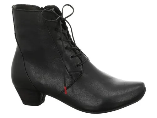 Boot van Think met een aparte hak van ca 3 cm in zwart leer op de leest Aida. Het voorblad van de boot is glad zonder naden en gemaakt van zacht en soepel leer. De voetbedden zijn uitneembaar. ||Think komt uit Oostenrijk en staat bekend om hun aparte modellen en uitvoeringen met daarbij hoogwaardige leersoorten. Meestal zijn de voetbedden uitneembaar.